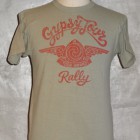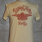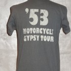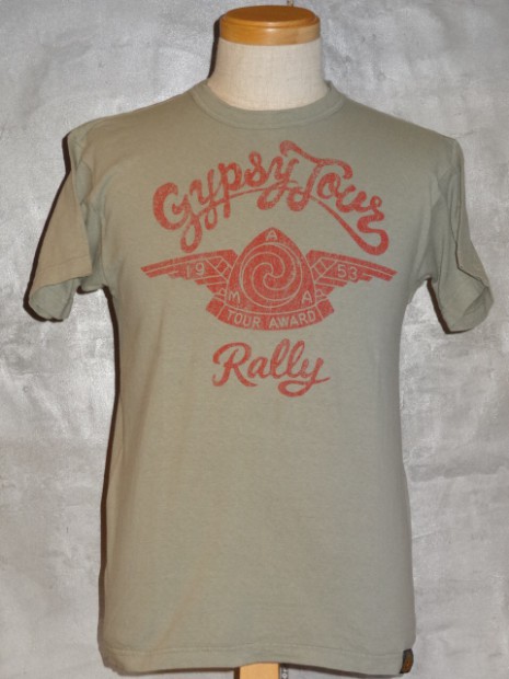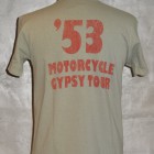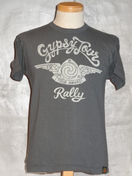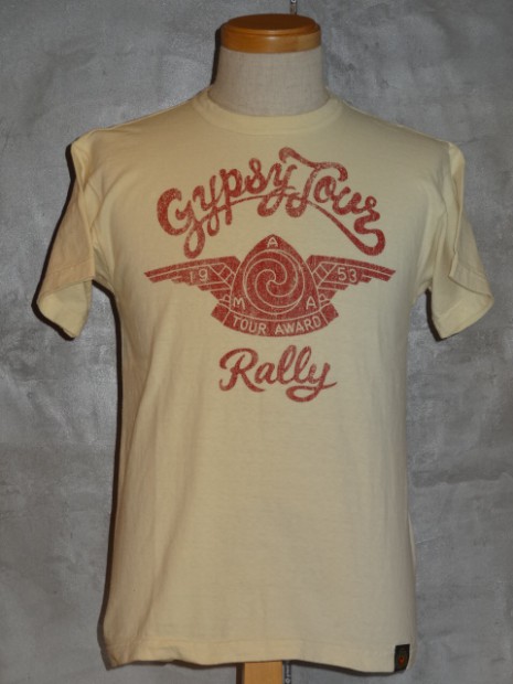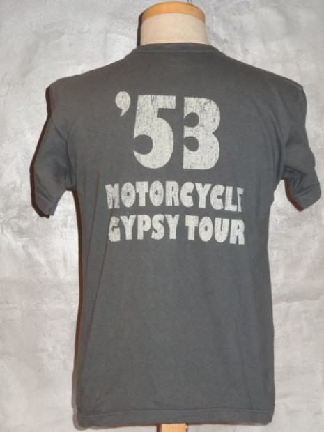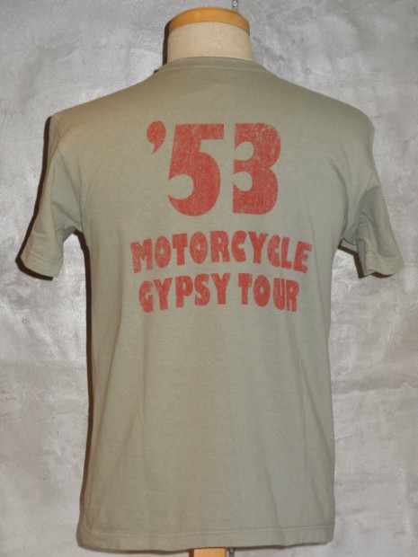 【TOYS McCOY】 1953年に開催されたAMA主催“GYPSY TOYR”がモチーフのTEEシャツです。正面のAMAロゴ&ウィングは当時のピンズからデザインをおこしたもので、アールデコ調の造形が美しい。GYPSY TOURとは公道ラリーで、皆が思い思いのバイクで参加する古き良き時代のイベントです。蛇足ではありますが同年に岡本 博が誕生したため、本人の思い入れが強い一枚です。