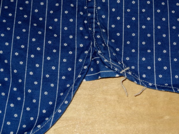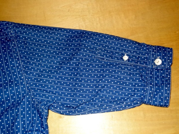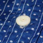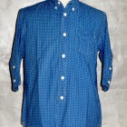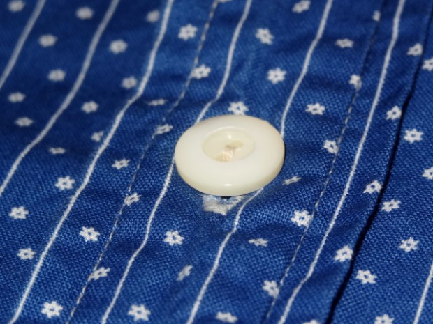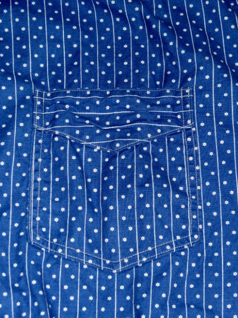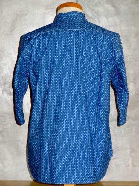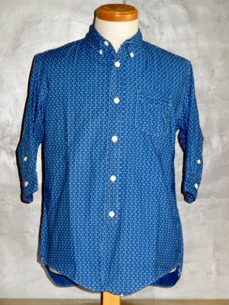 【WORKERS】 2014年春夏用に新たに起こした抜染柄。オリジナルのハギレから柄を起こしました。 インディゴの色もポルカドットが特濃にたいして、スターズアンドストライプスは一段薄いもの。 洗うごとに色が変化するインディゴ染め。色は移りますので洗濯、着用の際はご注意ください。 形は七分そで。夏場、長袖をまくって着るというのが定番でしたが最近のシャツは肘が狭いので二の腕まではまくる事が出来ない場合が多いです。そこで七分そでの出番。 通常は軽く長袖をまくったぐらいの袖丈、本当に暑い時は二の腕までまくる事が出来ます。 夏場、1枚で着て毎日洗う。結果、インディゴ独特の変化も楽しめつつ夏場を涼しくすごせるというのが狙いです。 今回、貝ボタンも新たに作成。厚みがあり、わずかに大きめのボタン。ビンテージでも大きかったり、厚かったり、ちょっと普通じゃないな、というサイズのボタンがあります。そういうものは、当時はごく適当な規格で作られていたため。現代では、既成ボタンの規格はかなり決まり切ってしまっています。そこで、14ミリ、厚めで別注しました。 ワンウォッシュ済の製品をお届けします。