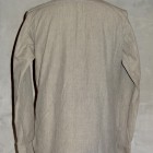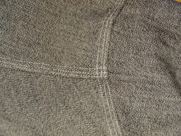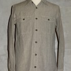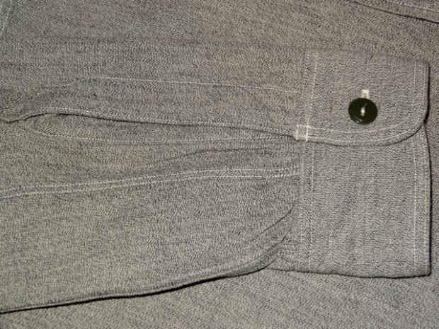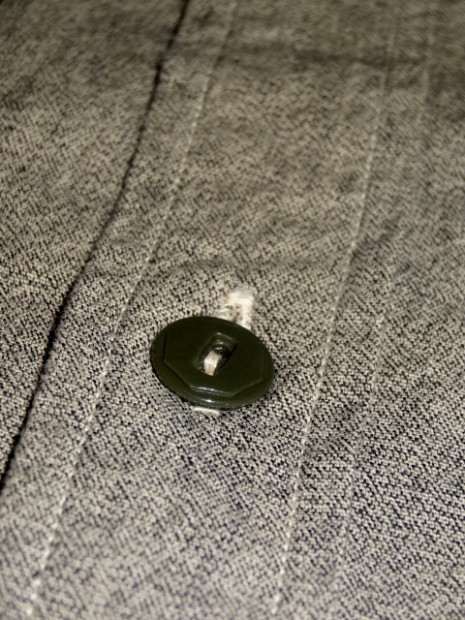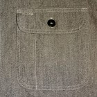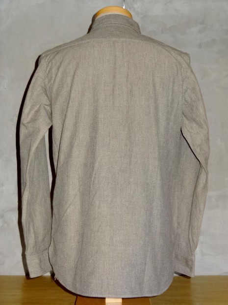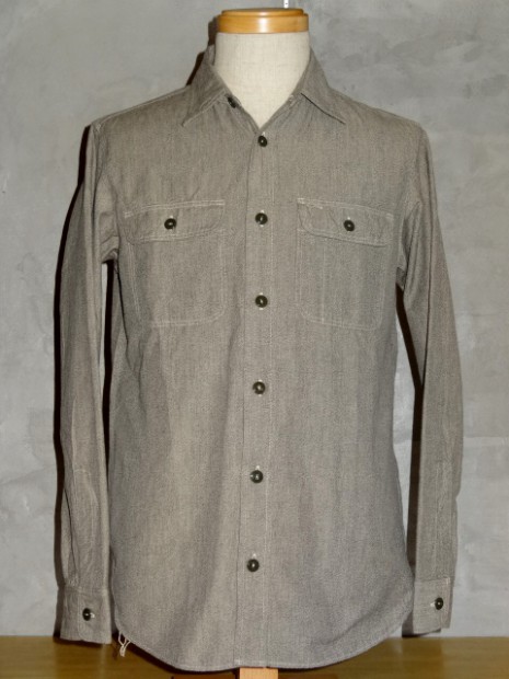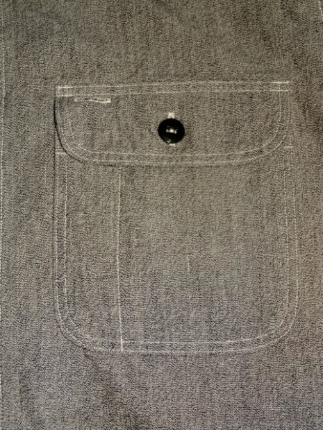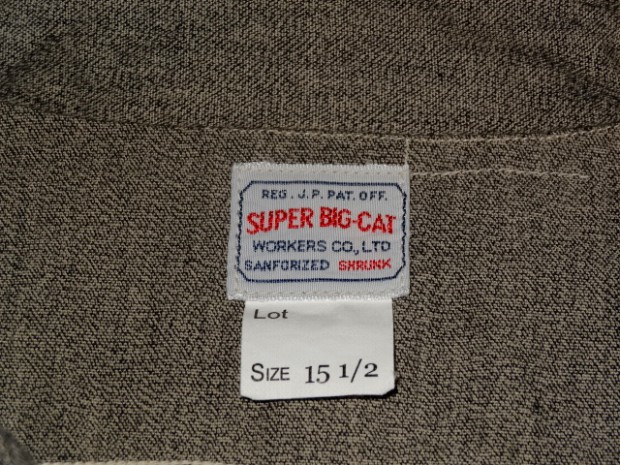 【WORKERS】 SUPER BIG MACのワークシャツを元に作りました。ネームはパロディでBIG CAT。 作りは2枚物の袖、場所によりトリプル・ダブル・針幅を使い分けた巻き縫い。 ぱっと見ると普通ですが、設備がないと作れない。作れそうでそう簡単には作れないワークシャツです。 素材はブラックの杢生地。一口に「杢」や「Cover Cloth」と言ってもその霜降りので具合がマチマチ。以前よりもグレイに近い物を使っています。 製品はOW済みです。