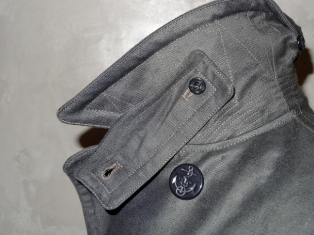 【TOYS McCOY】 米海軍で長きにわたって採用されているピーコートをモチーフに、コットングログランでアップデートした味わい深い一着。 デザインのベースは1930年代まで採用されていたハンドウォーマーとパッチポケットが配置されたもので、タウンユースにも訴求できるよう、裾の長さなが現代的にアップデートされています。 襟裏にはUSNのペンキ風プリントが施されているのも雰囲気を盛り上げてくれます。