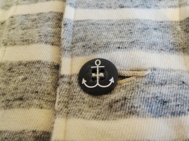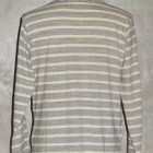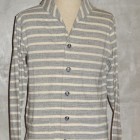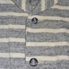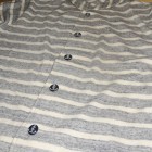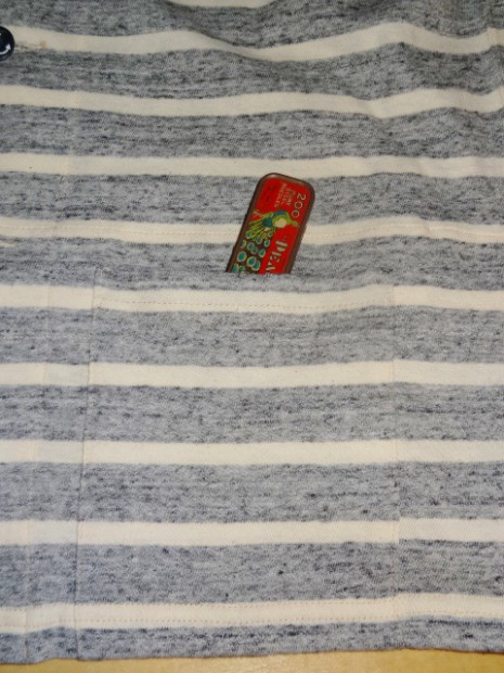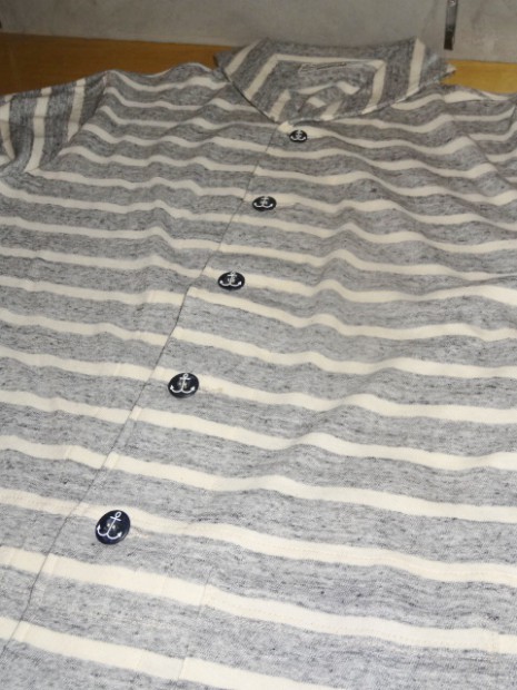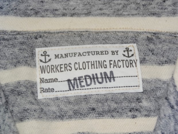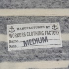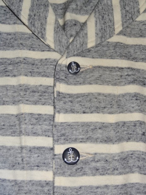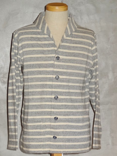 【WORKERS】 薄く、柔らかな天竺で作ったショールカラージャケット。 19番単糸で度目を甘く、テンションも緩めに編んだ天竺。ボーダーヘンリーの度詰め天竺とはま逆の編地。 グレー部分は杢糸使っているので、ボーダーと言ってもソリッド色を組み合わせた物とは一味違う雰囲気。 形はUS NAVYのショールカラーカバーオールを元に。外ポケットがあり、見返しから襟が続き断ちに成っています。ポケットは物を入れると言うよりハンドウォーマー的役割がメイン。 春先、少し寒い時にTシャツの上に。柔らかな天竺は皺に成りにくく、薄手なのでかさばらず鞄に入れる事も出来ます。朝は着て出かけ、昼間、花見をして暑く成れば脱いで鞄へ、また夕方涼しくなってきたら羽織る。そんな1枚です。 要所にはカンドメを打ち、縫い目のほつれどめをしています。 未洗いの製品をお送りします
