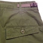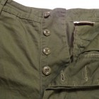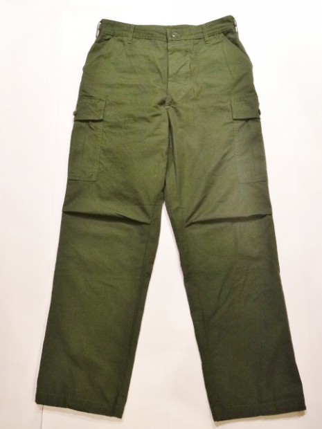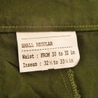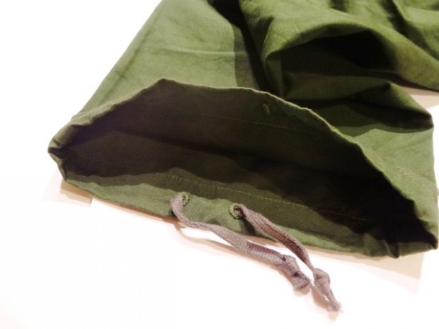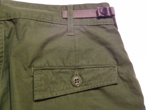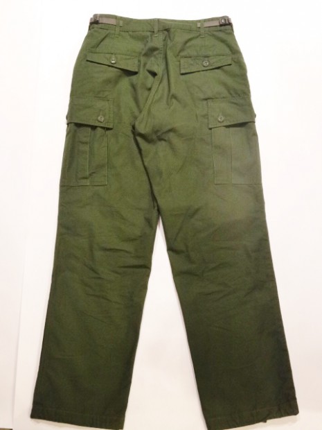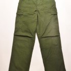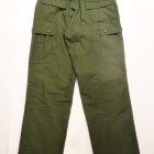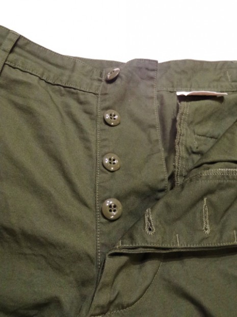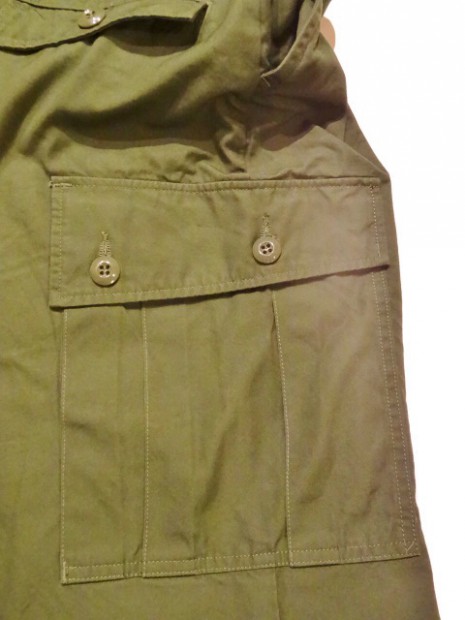 【WORKERS】 通称「ジャングルファティーグトラウザーズ(パンツ)」と呼ばれる、60年代、米軍で開発された熱帯用トラウザーズがモデル。オリジナルには、"TROUSERS, MEN'S, COTTON WIND RESISTANT POPLIN"とスペックに記載があります。 6ポケットの代表格というと、M-51やM-65などありますが、あちらは厚手。薄手、夏向きというとやはりジャングルファティーグが最右翼です。 私自身、ミリタリーのOD系トラウザーズに白シャツという組み合わせが好きです。ミスマッチの妙というか、特に6ポケットのOD系に白のシャツ(ブルーではなく)なのです。 そんな組み合わせを久しぶりに着たい、でも重苦しくない6ポケットを・・・と考えた時にジャングルファティーグをはきたく成りました。 前期から後期まであり、特に後記であれば今でもデッドストックが手に入ります。ならばそのまま作っても面白くないので、ディテールは前期・後記をミックス。型紙は、オリジナルの前期・後記をトレースして検討。ジャングルファティーグ自体、M-51のようにオーバーパンツではないので極端にまた上が深いこともなく変更は膝・裾の絞り程度。軍パンであり、その雰囲気は残しつつもより現代的に、街で着ても浮かないシルエットを目指しました。 素材はコットンポプリン。細番手の強撚糸を密に平織り。綿でありながら、若干ナイロン的なザラっとした手触りが特徴です。 ワンウォッシュ済の製品をお送りします。