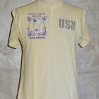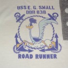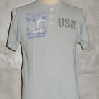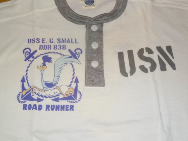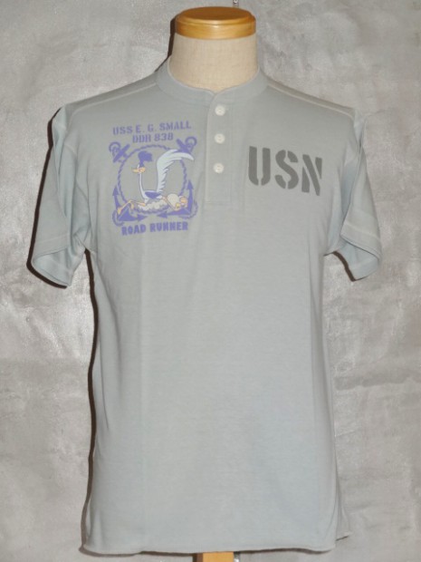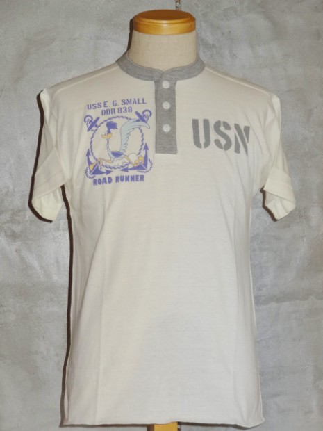 【TOYS McCOY】 クラシカルなヘンリーネックTシャツの右胸に、“アーネストGスモール”のスコードロンマークをプリント。同部隊が1959年から1961年まで採用したスコードロンはロードランナーをマスコットにしたデザインでした。ディフォルメされた実物のマークをワーナーブラザーズ公式ランセンスのもと、新たにデザイン、右胸にプリントしています。