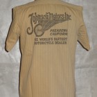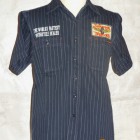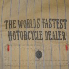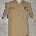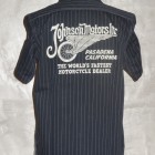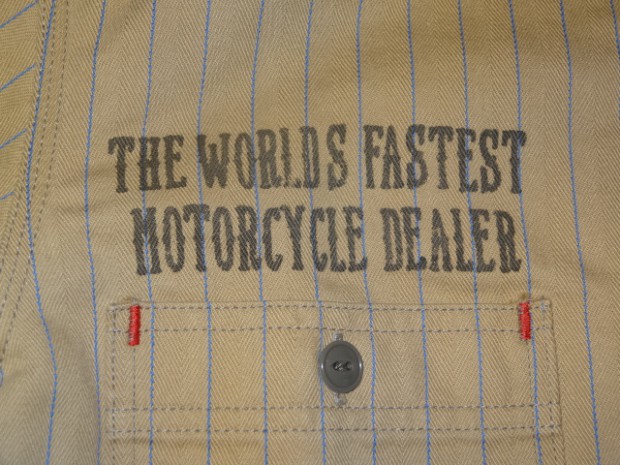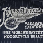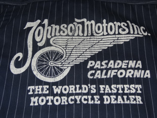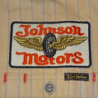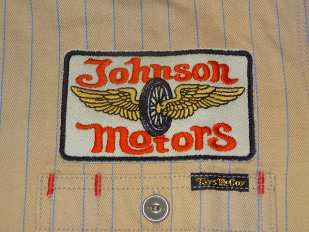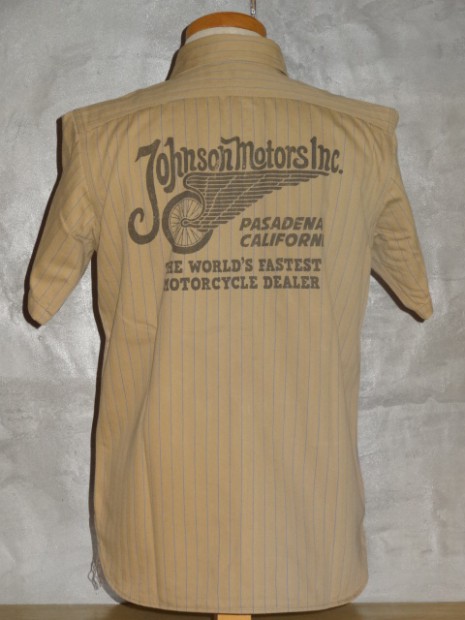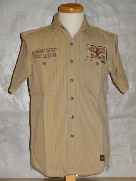 【TOYS McCOY】 オールドテイスト溢れるフライングホイールのロゴをバックにプリントしたジョンソン・モータース仕様の、ショートスリーヴ・カスタムシャツ。素材は薄くストライプを引いた肉厚のコットンヘリンボーンを使用。ワークシャツらしい頑強なトリプルステッチで縫製され、洗い込むごとに表情豊かに、さらには体に馴染んだシャツに仕上がってきます。