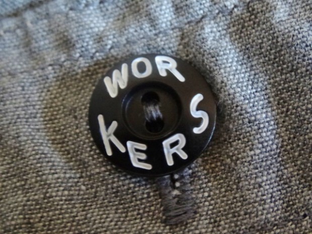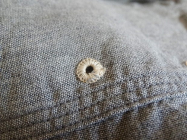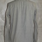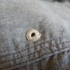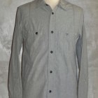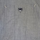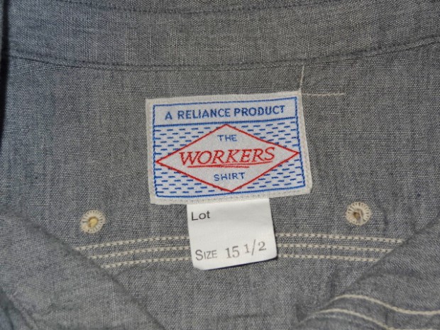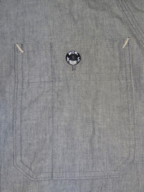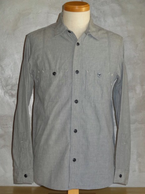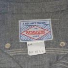 【WORKERS】 WORKERSの考える「最高のワークシャツ」。1928年、J.W.Championなる人が出願した特許のイラストを元に作りました。前立て、袖口の4本針環縫い。肩、袖ぐり、補強布をつける3本環縫い。2枚の袖をはぎ合わせる細幅の2本針環縫い。そして通気孔(ベンチレーションホール・菊穴)は約100年前のシンガー、99W67で開けています。 洗いこむごとに変化する色が魅力。落ち着いた印象のグレーシャンブレー。 ステッチを身頃に沈み込む同色系に、カン止め・菊穴は配色。細かな部分ですが、今まで作ってきた白ベースのステッチにグリーン配色カン止めとはまた違った雰囲気に。今回、ネーム・ボタンも新たに作りました。ボタンはすべて金属製。これも「特別なワークシャツ」ゆえの豪華仕様。ネームはReliance社のMilton F Goodmanシャツを元にしたデザイン。 お送りする製品はワンウォッシュ済です。