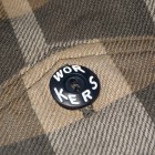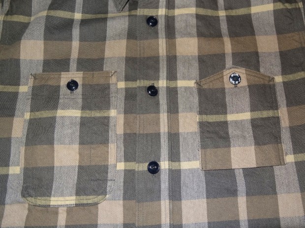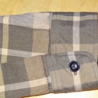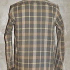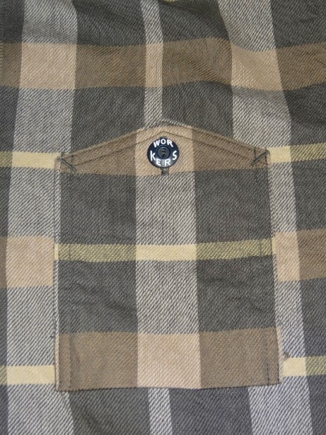 【WORKERS】 まずはじめに素材ありきのネルシャツ。毎シーズン、秋冬には地厚で手触りの良いネルシャツは欠かせません。ただ、年と共にレッド・ブルー・グリーンといった濃い色のネルが少し着づらくなってきました。そこで、グレー、ブルーグレー、ブラウンといった落ち着いた色を中心に使ったネルを作ってもらいました。当初、自分で指示したのはグレー・ブルーグレーだけだったのですが、さすが生地屋さん。同じピッチでブラウン系も見事な柄を作ってくれました。 ネルといっても起毛させていないので、厳密に言えば「綾織(ツイル)」ですが、ヨコ糸に10番という太めの糸を使うことでふっくら・地厚になっています。また、色糸は硫化で染めているので洗いこむごとに色が落ちていくのも特徴。こうして出来上がった生地を見ると、イメージするのが40-50年代ごろの地味なネル。古着好きな方ならわかっていただけると思うのですが、60-70年代の派手目かつもっと糸が太いヘビーネルとは違う、もう少し古い年代の糸が細く洗いこむと色がぼけていくあれです。そこで、形はクラシックなワークシャツのそれをあてはめました。仕様もネルでもあえてトリプルステッチ。左胸ポケットには刻印入りのメタルボタン。とても豪華なネルシャツになっています。 OW済の製品をお送りいたします。