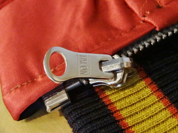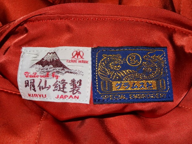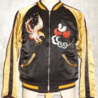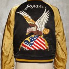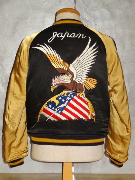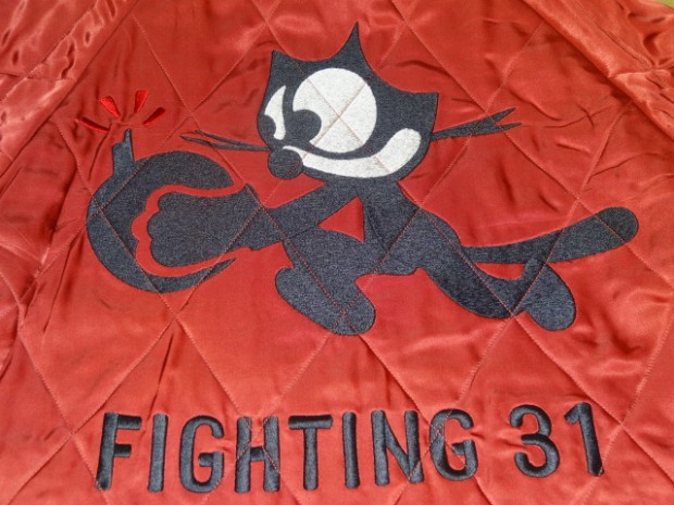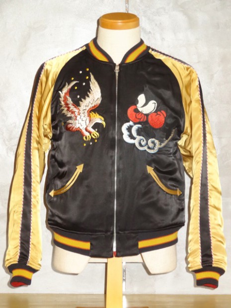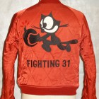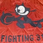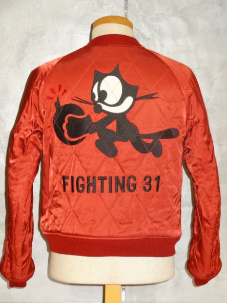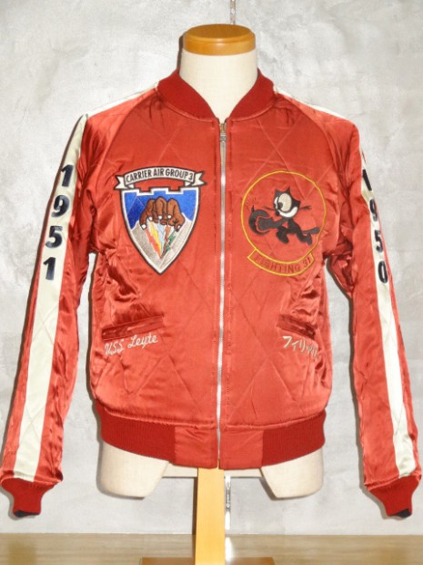 【TOYS McCOY】 かつて横須賀を拠点とする第7艦隊に所属し、朝鮮戦争で活躍した空母“レイテ”。その搭載部隊であったVF-31の搭乗員が寄港した折に発注した、という設定をもとに造られたスーベニアジャケットです。リバーシブルのキルティング仕様で作られた同モデルは、表、裏ともにレーヨンサテンを使用しています。これは戦後の物資不足の中でも比較的手に入りやすかったモノで、1950年代当時と同じ雰囲気を再現するために必要不可欠な素材として採用されました。刺繍は古くからその産地として栄え、当時の横須賀からの発注を一手に引き受けていた桐生にて製作しました。色とりどりの糸が折り重なった白頭鷲やFELIXなど、スカジャンならではの豪華な刺繍が堪能できます。