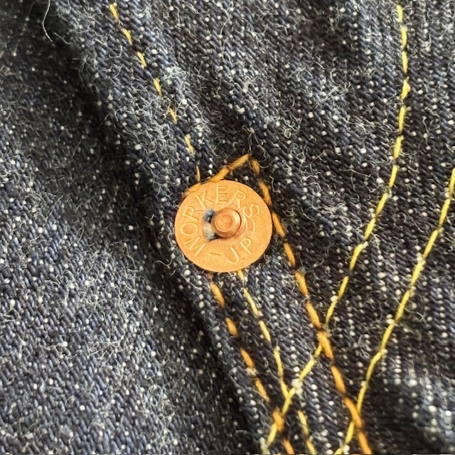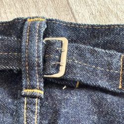 もう一つの特徴、股リベット。大戦モデルになると無くなってしまうリベットです。むかーし読んだ雑誌には当時のリーバイスの社長がたき火にあたっていてリベットが熱くなりすぎて股間を火傷して廃止になったという話が乗っていました。股リベ廃止の理由の一つと言われていましたが実際は大戦期に物資統制がかかって無くなったディティールの一つです。(火傷した人はおそらく実際にいたかもしれません)