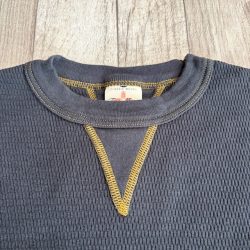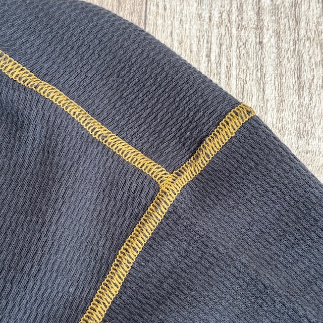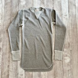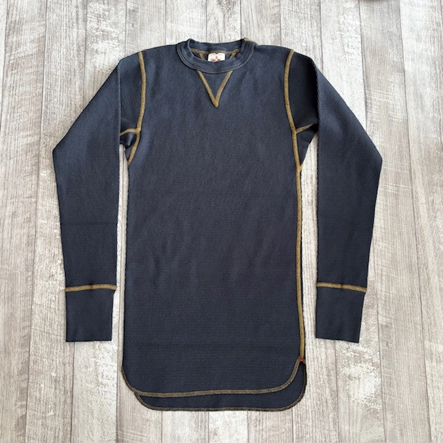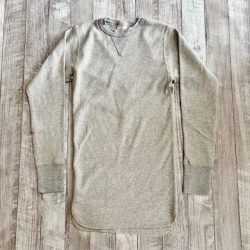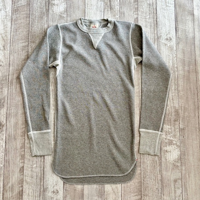 コットン100%のオールドサーマル。着た瞬間から暖かいです。伸縮性があり体にフィットさせて着用すると何とも言えない優しい暖かさです。この上にスウェットやネルシャツを着用すれば屋内で過ごす分には十分すぎるほど暖かいです。そしてなんといってもチクチク感が全くありません。TOWMOONさんと言えば4本針縫製が有名ですが肌着で着用してみるとその凄さが解ります。